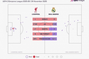 利物浦在本場比賽中將皇馬的預期進球(xG)限制在僅0.45,幾乎沒有給對手機會。
