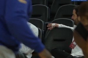 有人拍到庫明加的經(jīng)紀(jì)人與勇士總經(jīng)理鄧?yán)S在場(chǎng)邊聊天,而庫明加在鏡頭近景訓(xùn)練。