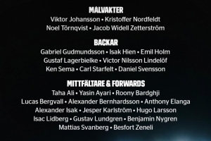 中前場:塔哈-阿里(馬爾默)、阿亞里(布萊頓)、巴德吉(巴薩)、貝里瓦爾(熱刺)、伯恩哈德森(荷爾斯泰因基爾)、伊蘭加(紐卡)、伊薩克(利物浦)、卡爾斯特羅姆(烏迪內(nèi)斯)、雨果-拉爾森(法蘭克福)、利德伯格(達(dá)姆施塔特)、倫德格倫(加爾斯)、本杰明-尼格倫(凱爾特人)、斯萬伯格(沃爾夫斯堡)、澤尼利(埃弗斯堡)