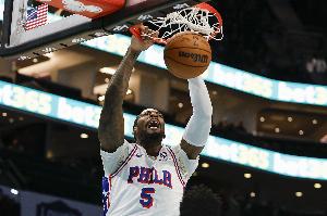 76人內(nèi)線德拉蒙德上半場替補出戰(zhàn)表現(xiàn)出色,不僅是前場籃板搶得很兇,籃下終結(jié)也很高效。