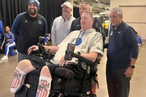 體育資訊11月06日訊 前NBA球員、53 歲的“大竹竿”肖恩·布拉德利今日坐輪椅觀戰(zhàn)獨行俠,并與他的獨行俠前隊友波派·瓊斯聊天。
