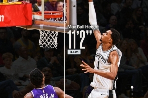 不過在比賽中,他仍有十佳球表現(xiàn)。NBA官方發(fā)布了他隔扣布朗尼一球的兩項(xiàng)數(shù)據(jù),其中球的最高點(diǎn)達(dá)到了3.4米,而文班亞馬這一扣的滑行距離達(dá)到2.2米。