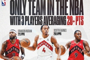 體育資訊11月6日訊 NBA Canada報道,猛龍隊是聯(lián)盟目前唯一一支有三位球員場均得分超過20分的球隊。