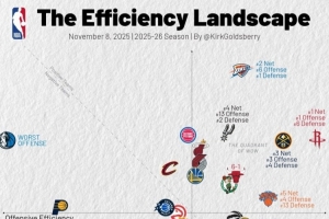 體育資訊11月7日訊 今天,數(shù)據(jù)專家Kirk Goldsberry更新了本賽季球隊(duì)的攻防效率值表。