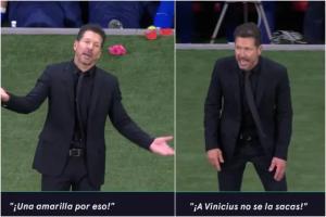 在一次犯規(guī)判罰之后,鏡頭拍到了馬競主帥西蒙尼正在對主裁曼薩諾抗議:“嘿!你在吹什么!冷靜點(diǎn)!就為了這個出牌?”西蒙尼最后又搖著頭說:“你不敢對維尼修斯出牌?!比缓笏侄⒅谒墓賳T重復(fù)了一遍這句話。