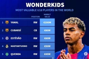 德轉(zhuǎn)列U18身價榜:亞馬爾、庫巴西、埃斯特旺、馬斯坦托諾列前四