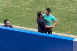現(xiàn)場實拍視頻顯示,馬寧準備向云南隊替補席的人員出示黃牌,隨后見到被出示黃牌的人員繼續(xù)抗議裁判,迅速跑到場邊。云南隊主教練立即試圖拉住馬寧,但馬寧最終還是出示紅牌將云南替補席上的工作人員紅牌罰下。