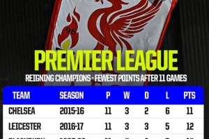體育資訊11月10日訊 在本輪英超,利物浦0-3不敵曼城,11輪過后只得到18分,OPTA也盤點了英超歷史衛(wèi)冕冠軍在前11輪過后最少積分情況,本賽季利物浦排在第四,具體如下: