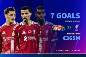 利物浦在今夏共計花費3.65億歐元基礎(chǔ)轉(zhuǎn)會費引進了維爾茨(勒沃庫森)、埃基蒂克(法蘭克福)、伊薩克(紐卡斯?fàn)枺?人至今共計貢獻7球5助攻。