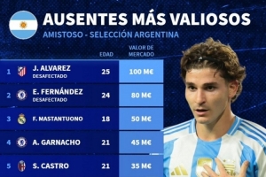 體育資訊11月12日訊 德國轉會市場統(tǒng)計了缺席本期阿根廷隊球員的身價,并列出榜單,阿爾瓦雷斯1億歐居首,恩佐-費爾南德斯8000萬歐次席。