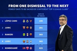 本世紀(jì)五大聯(lián)賽教練最短時(shí)間被三家俱樂(lè)部解雇排名: