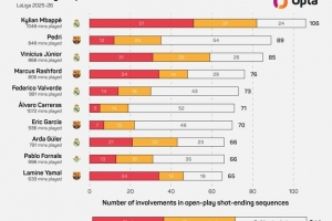 本賽季西甲參與有效進攻排名:姆巴佩106次居首,佩德里89次第二