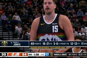 掘金VS快船,三節(jié)結束,約基奇52分11籃板6助攻1搶斷1蓋帽,22投17中,三分6中5,罰球14罰13中!各節(jié)得分分布:25+8+19。