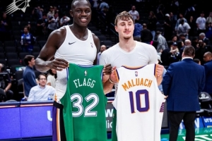 賽后,獨(dú)行俠狀元秀弗拉格和太陽首輪10號(hào)秀馬盧阿奇交換球衣。