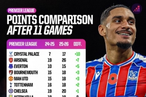 體育資訊11月14日訊 Opta統(tǒng)計了英超球隊本賽季前11輪比賽與上賽季同期積分的變化,并列出榜單,水晶宮+10分提升最大,阿森納+7分,利物浦-10分。