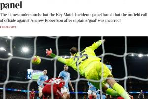 曼城vs利物浦比賽第38分鐘,范戴克頭球破門,但裁判組認定羅伯遜越位干擾,判進球無效。