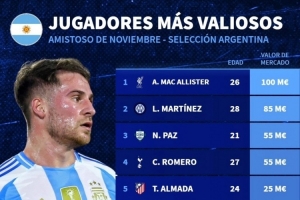 體育資訊11月15日訊 德國轉會市場統(tǒng)計了本期阿根廷隊名單的球員身價,麥卡利斯特1億歐居首,梅西1800萬歐排名第9位。