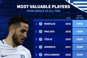 體育資訊11月16日訊 德國轉(zhuǎn)會市場統(tǒng)計了希臘球員的歷史最高身價,并列出希臘球員歷史身價排名,馬諾拉斯4500萬歐居首,帕夫利迪斯3500萬歐次席。