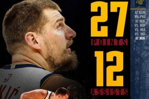 此役,官方數(shù)據(jù)凍結(jié)。掘金官方曬出了約基奇本場比賽數(shù)據(jù),27分10籃板12助攻,這是他本賽季第7次三雙。