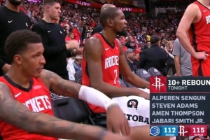 本場比賽火箭四人籃板上雙,據(jù)現(xiàn)場統(tǒng)計(jì),這是自隊(duì)史2001年來首次。