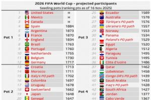 體育資訊11月17日訊 世預(yù)賽激戰(zhàn)正酣,目前世界杯48支參賽隊(duì)已確定32席,數(shù)據(jù)機(jī)構(gòu)Football Meets Data給出了最新的世界杯分檔預(yù)測。