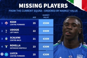 缺席本期意大利隊(duì)球員身價(jià)榜:小基恩5000萬(wàn)歐居首 烏多吉第二
