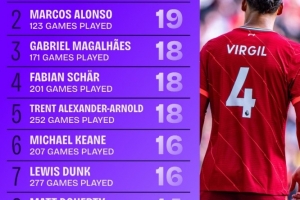 17-18賽季來(lái)英超后衛(wèi)進(jìn)球榜:范戴克21球居首,加布里埃爾18球第3