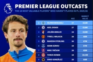 *榜單中一共有18名非門將球員,這些球員沒有受到傷病困擾,但至今未在本賽季英超出戰(zhàn)過1分鐘。