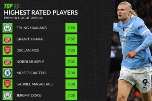 WhoScored本賽季英超評(píng)分榜:哈蘭德7.90居首,扎卡7.37第二