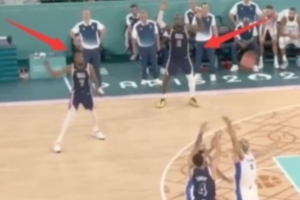 談到巴黎奧運(yùn)會決賽“金色匕首”驚世一投,庫里笑道:“我到現(xiàn)在想到那張照片就想笑,你(指詹姆斯)和KD在那兒高舉著雙手(要球)?!?/p>