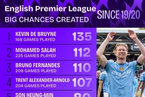 體育資訊11月19日訊 Squawka統(tǒng)計了2019-2020賽季以來球員在英超創(chuàng)造重大機(jī)會的次數(shù),并列出榜單,德布勞內(nèi)、薩拉赫、B費排名前三位。