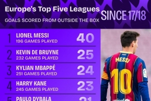 體育資訊11月19日訊 Squawka統(tǒng)計了2017-2018賽季以來球員在五大聯(lián)賽禁區(qū)外遠射的進球數(shù)量,并列出榜單,梅西40球居首,德布勞內25球次席。
