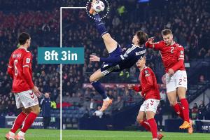 據(jù)太陽報統(tǒng)計(jì),麥克托米奈倒鉤時腳部高度達(dá)到了8英尺3英寸(約2.53米),比C羅在皇馬時對陣尤文的倒鉤高度(7英尺7英寸,約2.38米)還要高。