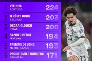 世歐預(yù)進(jìn)攻三區(qū)成功傳球榜:維蒂尼亞壓多庫(kù)居首,德容、魔笛在列