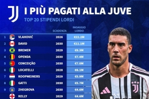 體育資訊11月20日訊 德國轉(zhuǎn)會(huì)市場統(tǒng)計(jì)了尤文球員的稅前年薪,并列出前二十名榜單,弗拉霍維奇2220萬歐居首,戴維1110萬歐次席。