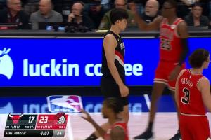 NBA常規(guī)賽,開拓者坐鎮(zhèn)主場迎戰(zhàn)公牛,首節(jié)進行到4分07秒時,中鋒楊瀚森替補登場。
