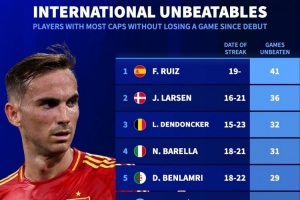 體育資訊11月20日訊 德國轉會市場統(tǒng)計了本世紀球員在國家隊的連續(xù)不敗場次數(shù)據(jù),并列出榜單,法比安·魯伊斯連續(xù)41場不敗居首。