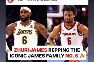 詹姆斯轉(zhuǎn)發(fā)了媒體曬出的他和三個(gè)子女都身穿6號(hào)球衣的照片。詹姆斯的兩個(gè)兒子布朗尼和布萊斯在大學(xué)打籃球時(shí)都身穿6號(hào)球衣,女兒Zhuri在學(xué)校打排球時(shí)身穿6號(hào)球衣。詹姆斯本人在熱火和湖人也有6個(gè)賽季身穿6號(hào)球衣。