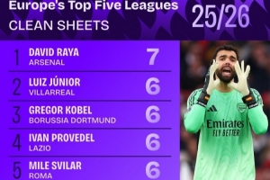 體育資訊11月21日訊 五大聯(lián)賽戰(zhàn)火即將重燃,數(shù)據(jù)機(jī)構(gòu)squakwa也統(tǒng)計(jì)了本賽季五大聯(lián)賽門將零封場次榜,槍手門將拉亞居首。