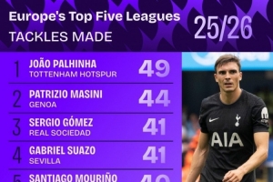 本賽季五大聯(lián)賽成功搶斷排名: