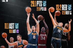 約基奇賽季至今場均29.1分13.2籃板11.1助攻