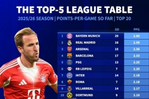 本賽季聯(lián)賽場均拿分榜:拜仁領(lǐng)跑,皇馬、阿森納、巴薩分列前四