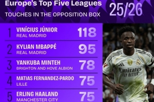禁區(qū)觸球榜:維尼修斯壓姆巴佩居首,哈蘭德、亞馬爾、薩拉赫在列