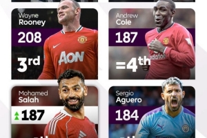 英超官方數(shù)據(jù)顯示,薩拉赫現(xiàn)在已經(jīng)打入187個(gè)英超進(jìn)球,在英超歷史射手榜上追平安迪-科爾,并列第四。