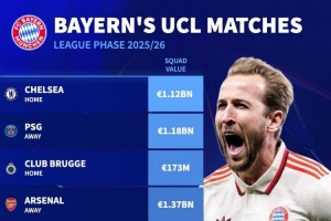 體育資訊8月29日訊 本賽季歐冠聯(lián)賽階段對陣抽簽結(jié)果出爐,德國轉(zhuǎn)會市場盤點了拜仁對手的身價。