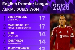 體育資訊9月3日訊 數(shù)據(jù)機構(gòu)squakwa統(tǒng)計了新賽季英超球員解圍情況,兩位荷蘭中衛(wèi)并列榜首。