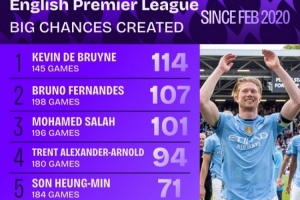 體育資訊9月7日訊 squakwa統(tǒng)計了自B費加盟曼聯(lián)以來的英超同期創(chuàng)造重大機會情況,數(shù)據(jù)統(tǒng)計顯示B費僅次于德布勞內(nèi)。