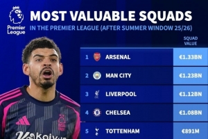 英超球隊(duì)德轉(zhuǎn)身價(jià)排名: