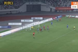 判例三:中甲聯(lián)賽第24輪,蘇州東吳vs南京城市。比賽第48分鐘,蘇州東吳6號(hào)隊(duì)員頭球射門,南京城市守門員將球撲出,助理裁判員示意球的整體已經(jīng)越過(guò)球門線,裁判員判蘇州東吳隊(duì)進(jìn)球得分。