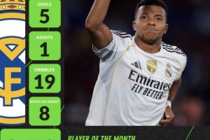 姆巴佩在9月的4場西甲打進5球,助攻1次。期間完成19次成功過人,8次射正目標。Whoscored評分達到了8.53分。